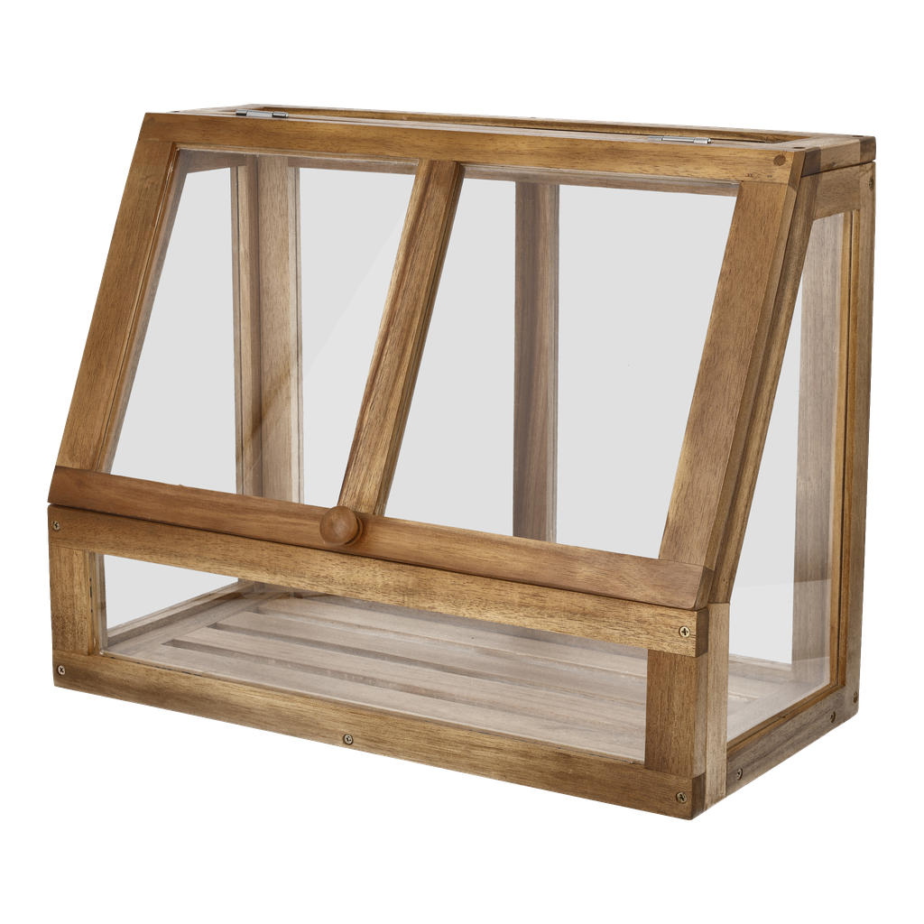 Schmale Anzuchtschale mit transparenter Haube und verstellbaren Belüftungsschlitzen für die Anzucht junger Pflanzen. Kann mit oder ohne Füße verwendet werden.