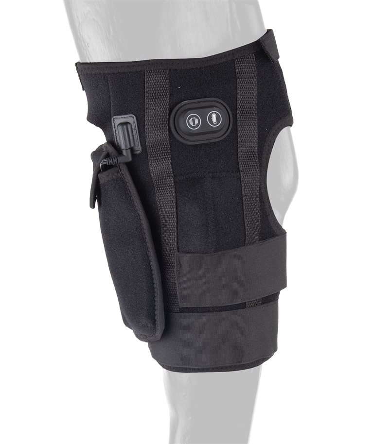 Knee brace for right front knee. Equipped with three hook and loop fasteners.