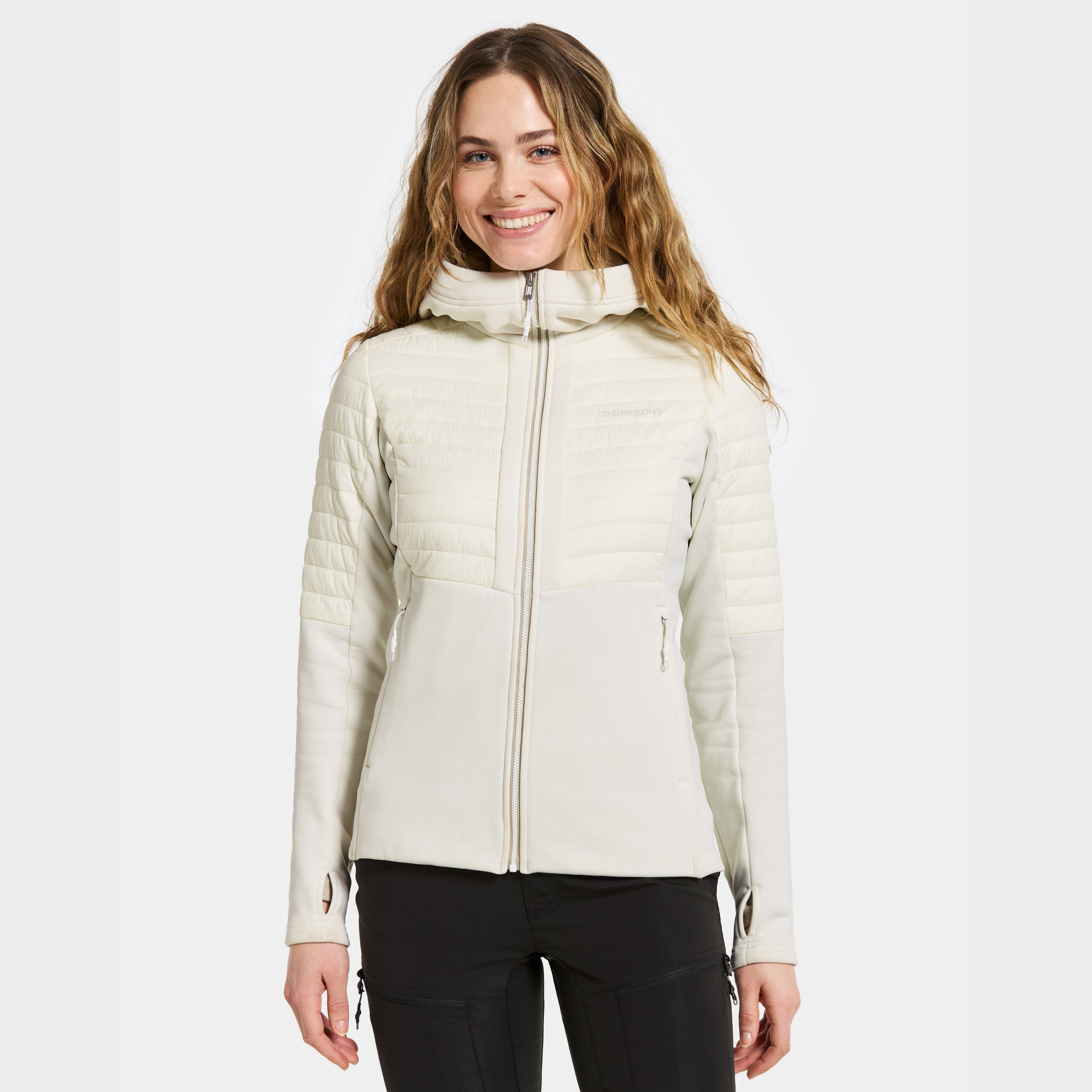 Annema is a stylish hybrid jacket designed for women who love to be active outdoors. It features padded sections at the front and back for extra warmth, while the stretch fabric provides optimal comfort and freedom of movement. The jacket has a fixed hood and an ergonomic cut that follows the body's contours. With a front zip closure and practical front pockets with zips, it is both functional and comfortable. The cuffs are equipped with thumbholes for extra protection and warmth. The jacket has a shaped and feminine construction that is perfect for layering. Padding: 115 g/m² Designed in Sweden, produced in China.