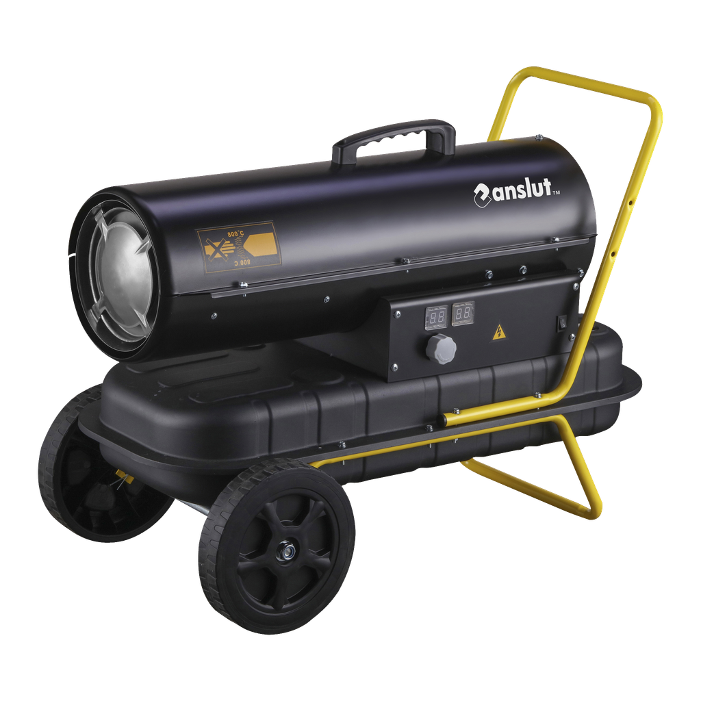 Dieselvarmer for 300 m². Med justerbar termostat, drivstoffmåler, flammesensor, overopphetings- og kortslutningsvern. Drives av diesel/parafin.