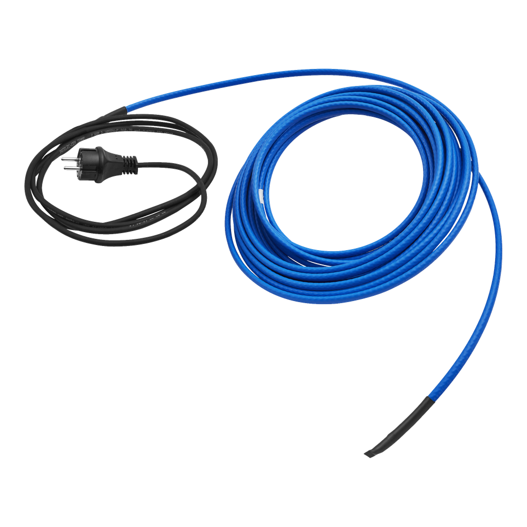 Mobil frostsikringskabel med jordet støpsel som kan kobles direkte til 230 V. Tilpasser seg etter omgivelsestemperaturen og passer på de fleste bruksområder, for eksempel vann-/avløpsrør og drivhus. 1-faset.