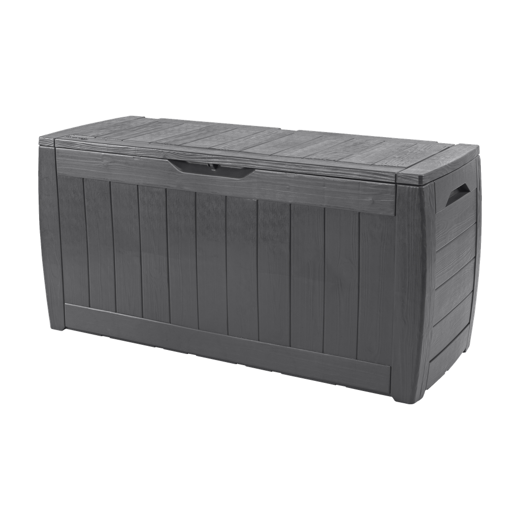 Værbestandig putekasse, også perfekt å bruke som sittebenk. Kassen rommer 302 l, og lokket tåler en belastning på 250 kg. Lokket er låsbart.