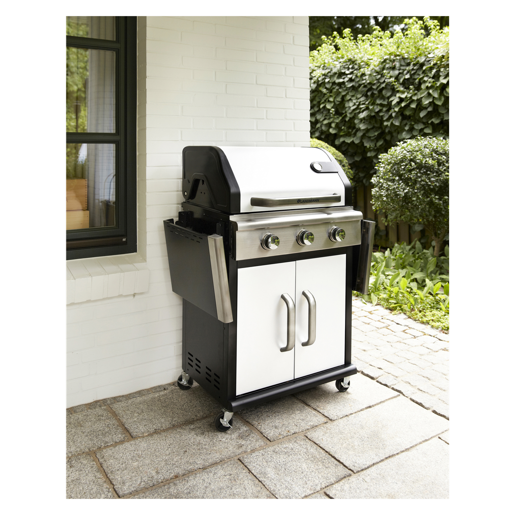Kombinerad kol-/gasolgrill med röklåda och fyra brännare (inklusive en sidobrännare). Ett emaljerat grillgaller och ett galler av gjutjärn ser till att värmen håller länge. Rejäl konstruktion med pulverlackerad stomme, lock och eldskål.