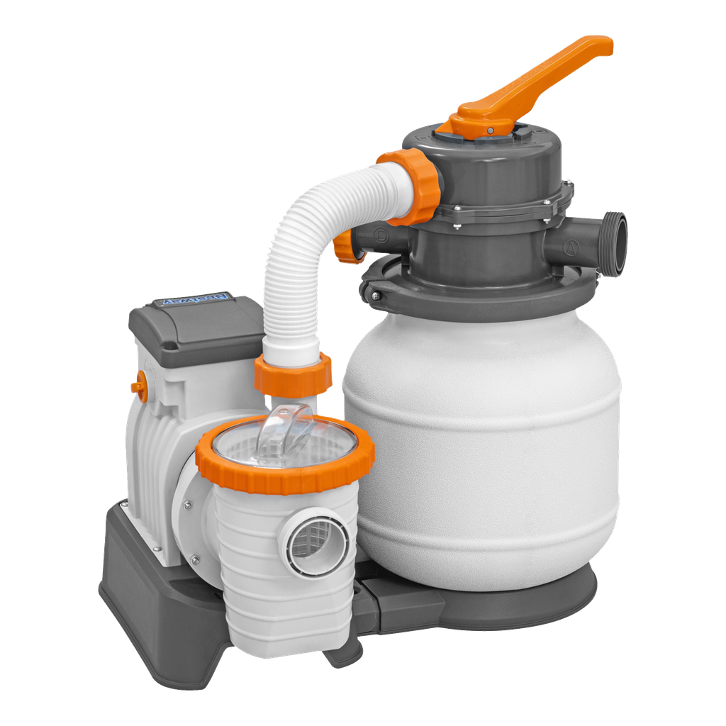 Sandfilterpump för badtunnor, spabad och pooler upp till 42000 liter. Har inbyggd timer och 6-vägsventil samt en klordispenser. Filtersand sälj separat.