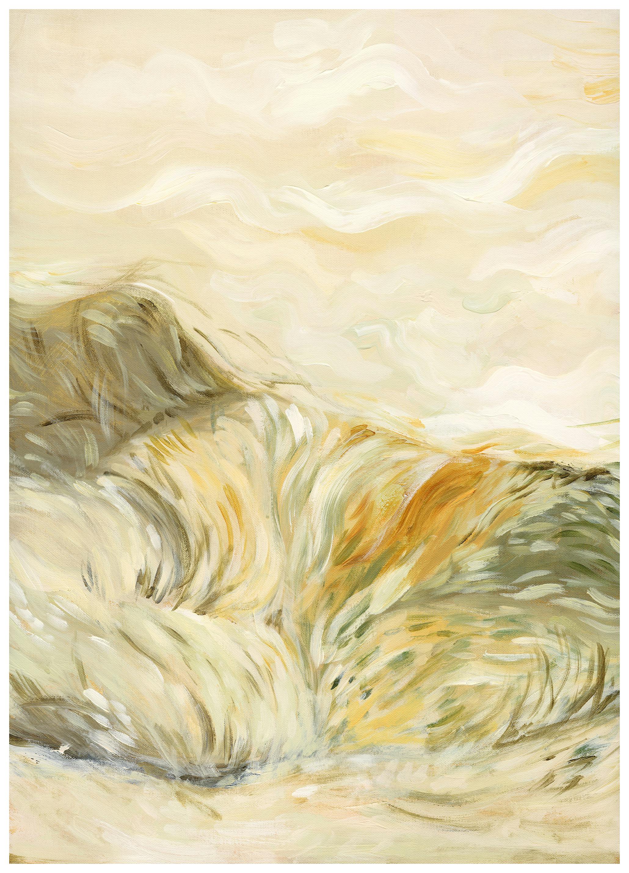 En poster som visar en figur med blått hår omgiven av röda och orangea bladmönster. Enkla linjer och varma färger skapar en lugn design.
