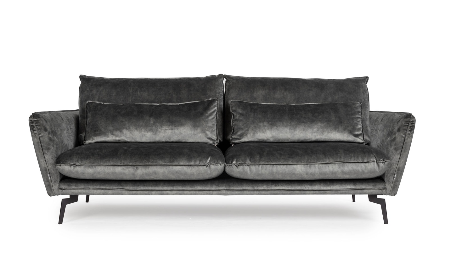 Modern soffa med tunn ram som gör att sittytan utnyttjas till max. De tjocka, sköna dynorna är stoppade med högresistent kallskum 35kg med sjöfågeldun och riven polyeter på toppen. Benen har väl tilltagen höjd och är svagt utåtställda. 2st dekorationskuddar ingår som man kan vika över armstöden.