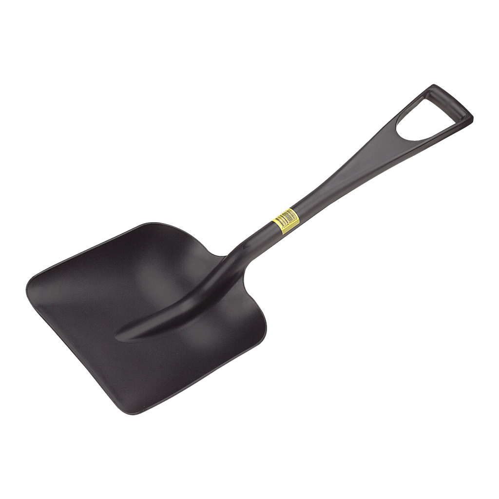 Robust snöraka med plastblad, omvikt slitskena av stål, träskaft och plasthandtag.