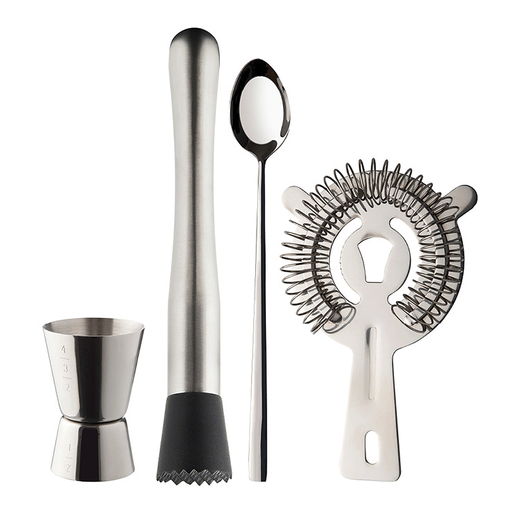 Setet innehåller en mätbägare, shaker, cocktailsil, barsked och Mojito-mortel.Mätbägare: Mät upp rätt blandningsförhållanden med hjälp av mätbägaren och häll i shakern.Shaker: Häll önskade ingredienser och isbitar i shakern och skaka ordentligt så att allt blandas väl.En cocktailsil används för att sila drinkar. När du har skakat drinken, sila den i serveringsglas utan att isbitar, fruktkött eller örter kommer med. Barsked: Den plana basen kan krossa ingredienser såsom mynta och lime. Skeden är lång och snodd, vilket passar perfekt för användning i shakers och i longdrinkglas.Mojito-mortel: Ett nödvändigt verktyg när man krossar frukt och örter för exempelvis drinken Mojito. Morteln ger ett bra grepp som gör den lätt att arbeta med.Tillverkad av 18/10 stål med en snygg kopparfärgad beläggning. Kan diskas i diskmaskinen men det är bäst om du torkar av den med en fuktig trasa. Kom ihåg att allt rostfritt stål också kan rosta om det utsätts för fukt över tid. Torka därför av med en mjuk,