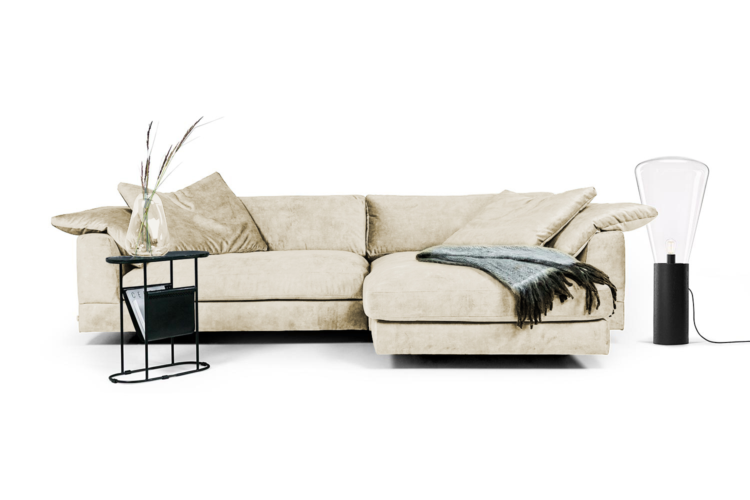 Divansoffa med hög kvalitet och komfort. Sittplymåerna är stoppade med högresistent kallskum och ryggkuddarna innehåller fiber och rivet kallskum. De lite högre, snedställda benen på gör det enkelt att hålla rent med dammsugaren under soffan. Klädseln är avtagbar på både sitt- och ryggkuddar.