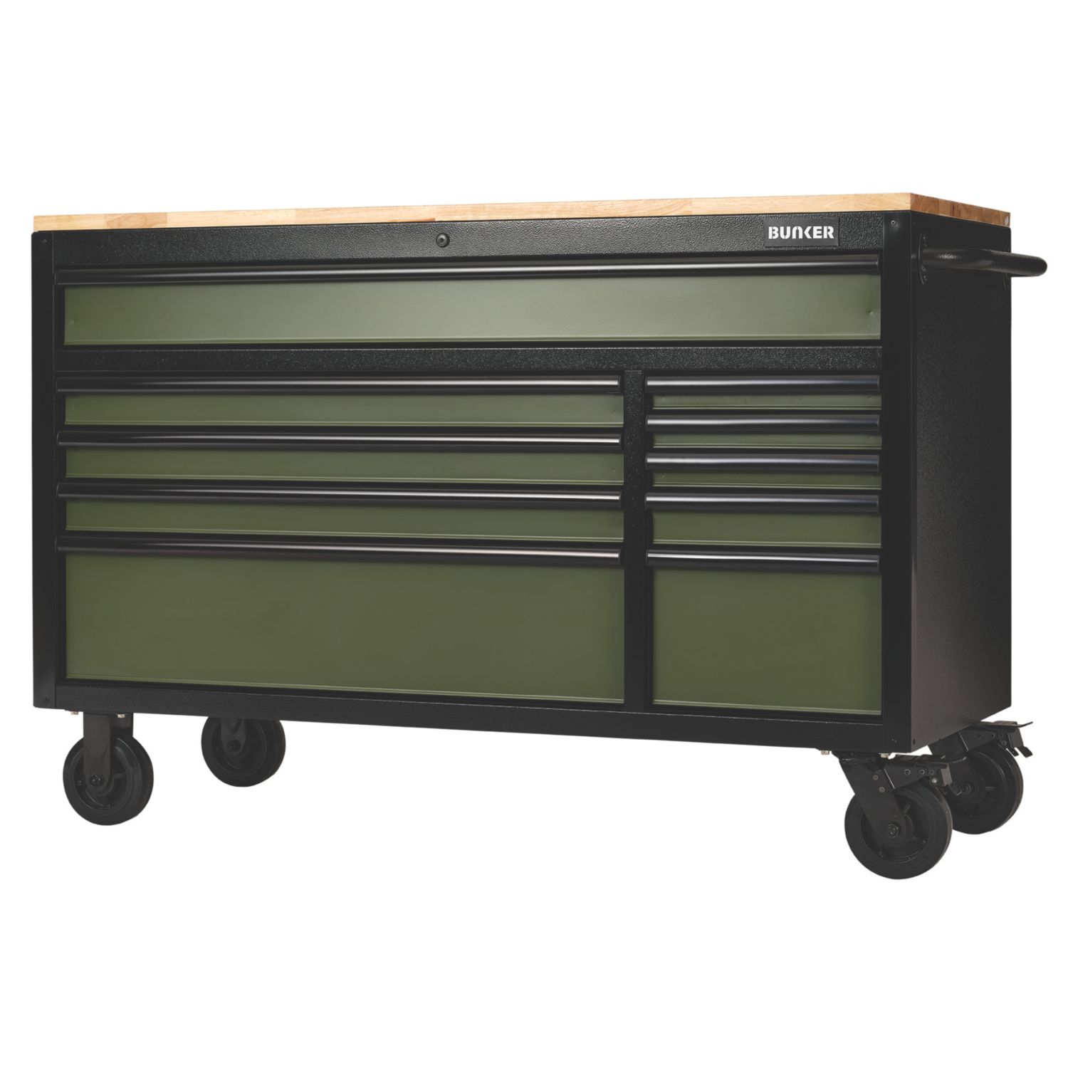 Roller workstation with resilient matt grey textured coating to protect against scratches and wear. Features 10 foam-lined drawers with soft-close mechanism, integrated lock, and 25mm hardwood worktop offering space for daily tasks. Also includes 2 cupboards and 2 shelves connected by pegboards to provide easy access to tools, as well as a storage tray for small parts and equipment. Easy to manoeuvre with steel handle, and 4 castors, 2 fitted with brakes. Steel Construction Matt Finish Cylinder Key Locking Soft-Close Ball Bearing Drawer Slides Hardwood Worktop 1 Year Guarantee Foam-Lined Drawers Steel Handle Steel Construction Matt Finish Cylinder Key Locking Soft-Close Ball Bearing Drawer Slides Hardwood Worktop 1 Year Guarantee Foam-Lined Drawers Steel Handle