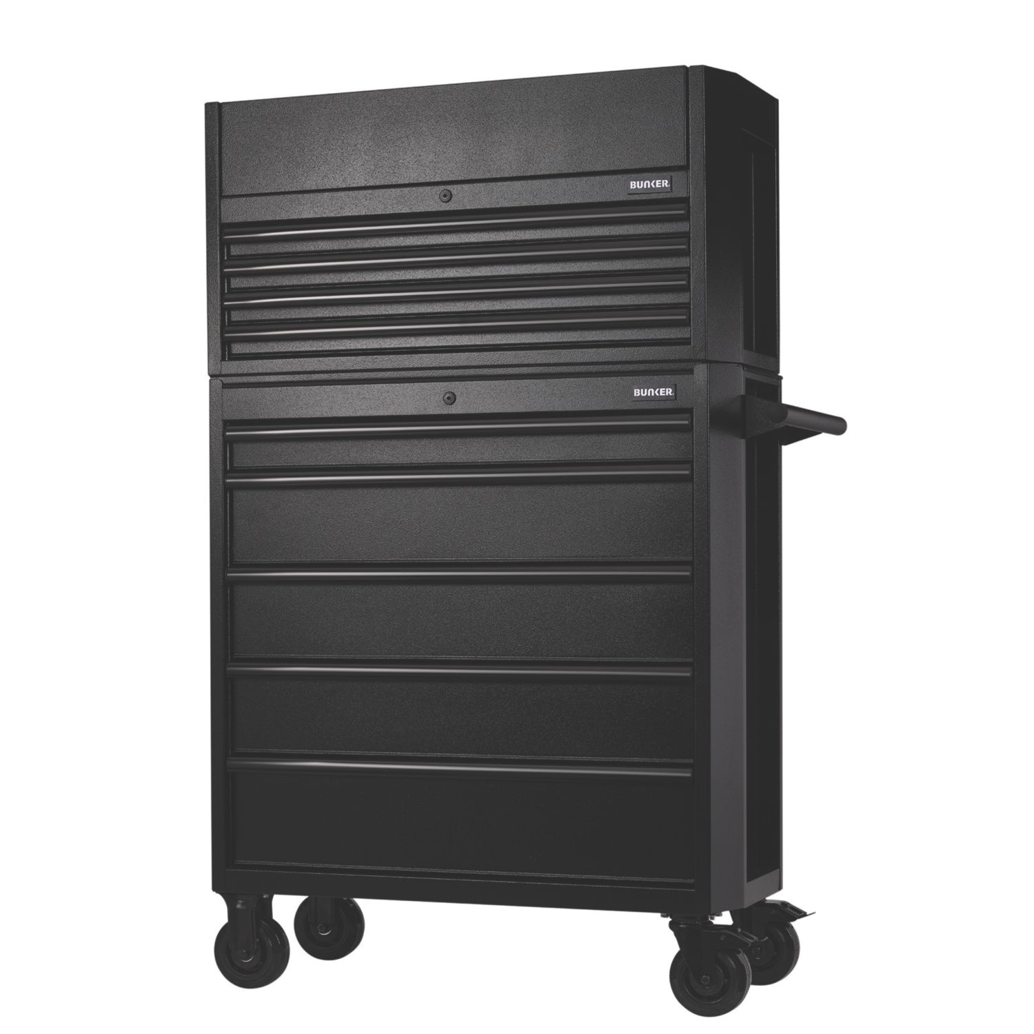Roller tool cabinet with scratch and wear-resistant matt textured finish, and a sleek, black anodised aluminium trim. Features 7 soft-close drawers with EVA foam lining to protect tools, integrated lock with 2 keys, and 25mm hardwood worktop offering a spacious and convenient workspace. Designed for mobility with a steel handle and 4 castors, 2 fitted with brakes. Blue. Steel Construction Matt Finish Cylinder Key Locking Soft-Close Ball Bearing Drawer Slides Hardwood Worktop 1 Year Guarantee Foam-Lined Drawers Steel Construction Matt Finish Cylinder Key Locking Soft-Close Ball Bearing Drawer Slides Hardwood Worktop 1 Year Guarantee Foam-Lined Drawers
