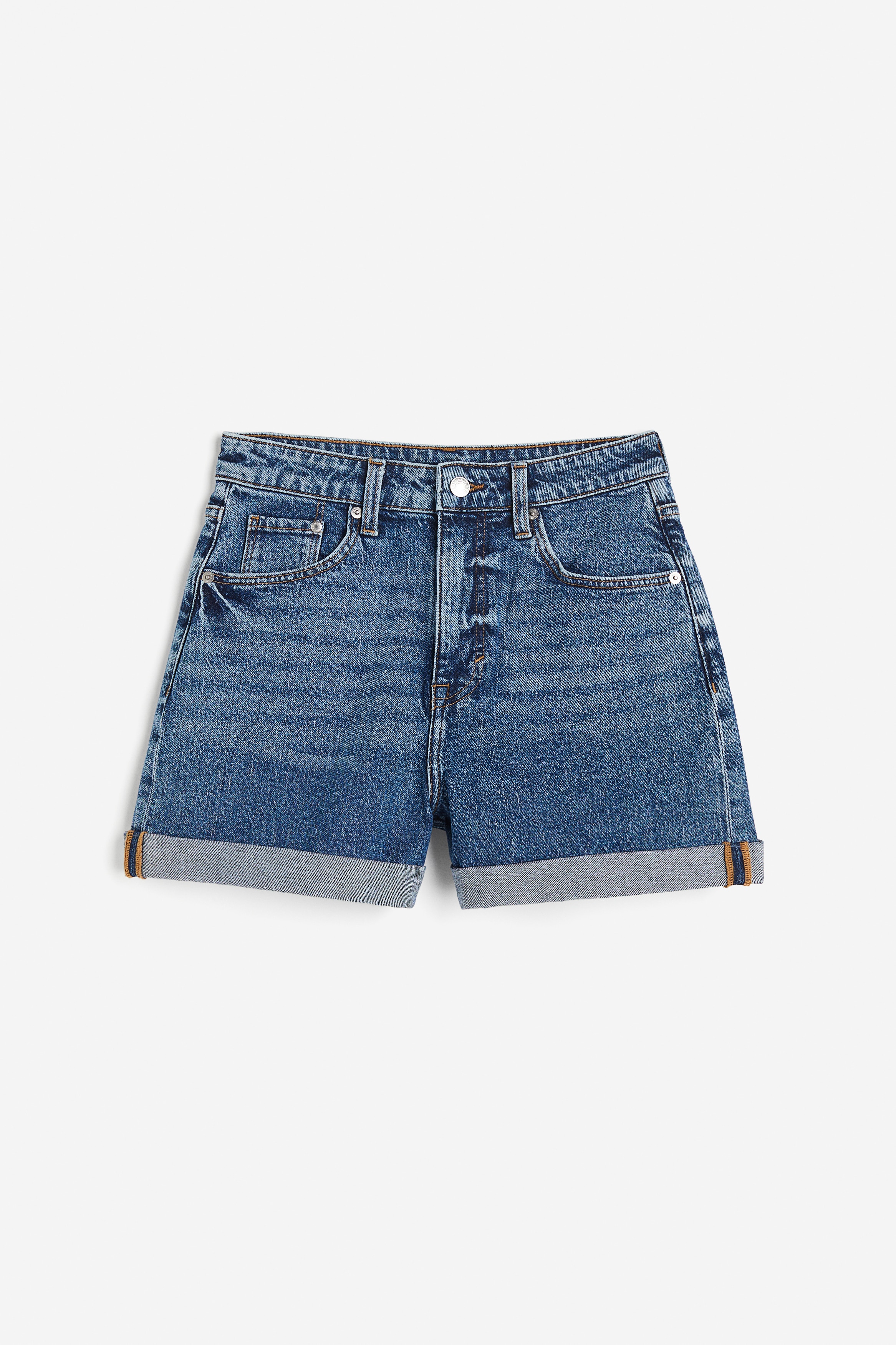 Knee-length, 5-pocket shorts in rigid cotton denim with creases down the front and back. Loose fit with a low waist and a zip fly and button.