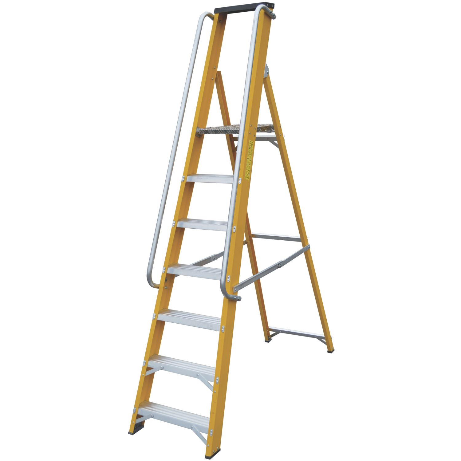 The Mac Allister aluminium 4-step platform step ladder provides a secure and stable elevated working platform for professional use. This aluminium stepladder is ideal for various trade tasks on job sites, such as painting and decorating or accessing high-level storage. Constructed from lightweight aluminium making it easy to transport and position. It features a platform with slip-resistant flat treads for stability and user safety. Designed for reliability, this robust platform ladder supports a maximum static vertical load of 150kg. Closed to Max. Open Height: 1.54 - 1.44m Platform H x W: 0.83m x 282mm Max. Static Vertical Load: 150kg Total Product Weight: 4.12 kg Anti-Slip 1 Year Guarantee Closed to Max. Open Height: 1.54 - 1.44m Platform H x W: 0.83m x 282mm Max. Static Vertical Load: 150kg Total Product Weight: 4.12 kg Anti-Slip 1 Year Guarantee