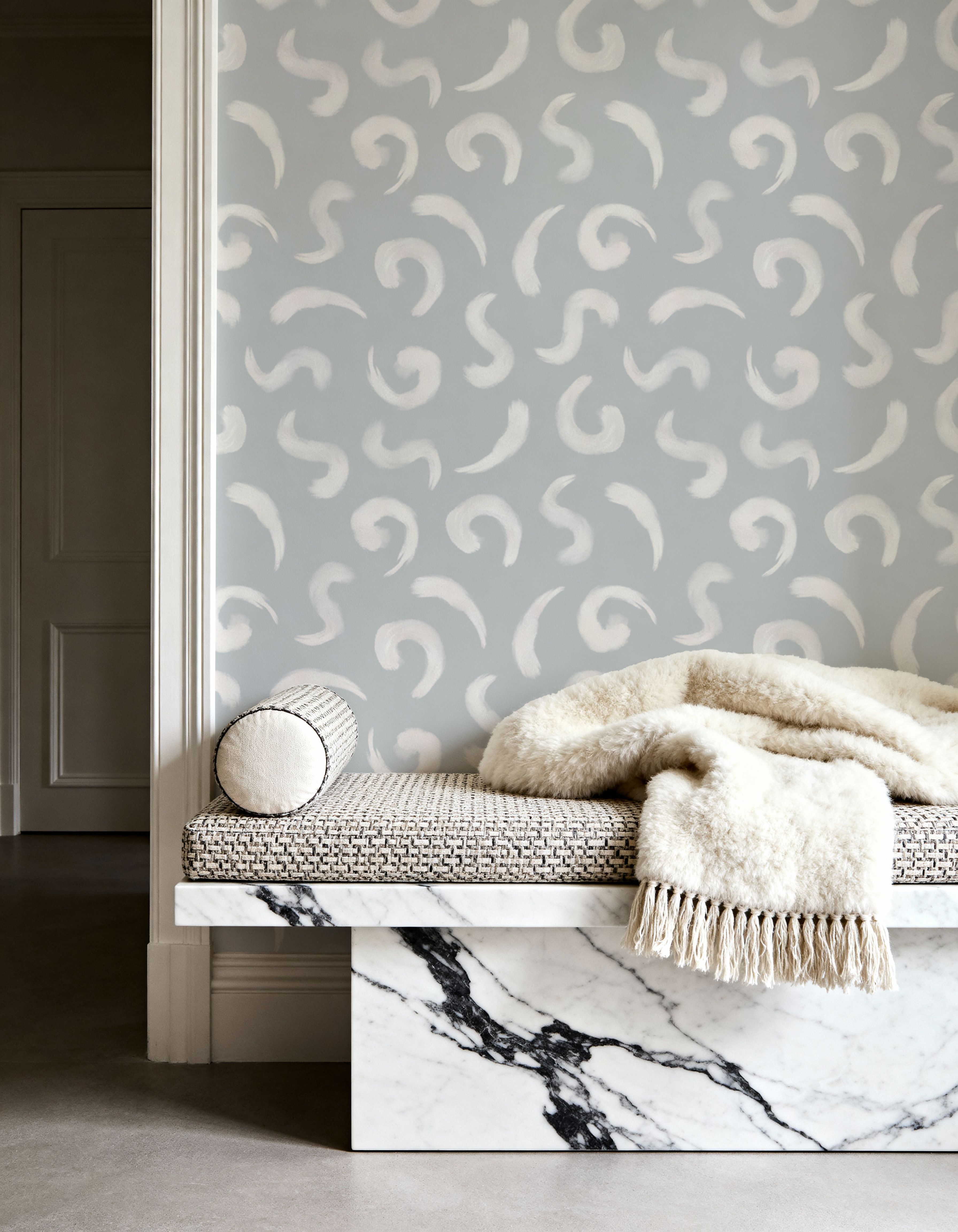 Flowing white lines ripple across a denim blue background, forming a bold zigzag pattern that adds movement and rhythm to your walls. The textured surface gives the blue base a grainy, almost stone-like quality, bringing depth and a tactile appearance to the design. This artistic and whimsical wallpaper creates a playful mood, making it a great choice for creative spaces like a child's room, a hallway, or a casual living area. The neutral tones and abstract wave pattern make it versatile for modern interiors, whilst the dynamic design adds visual interest without overwhelming the space.