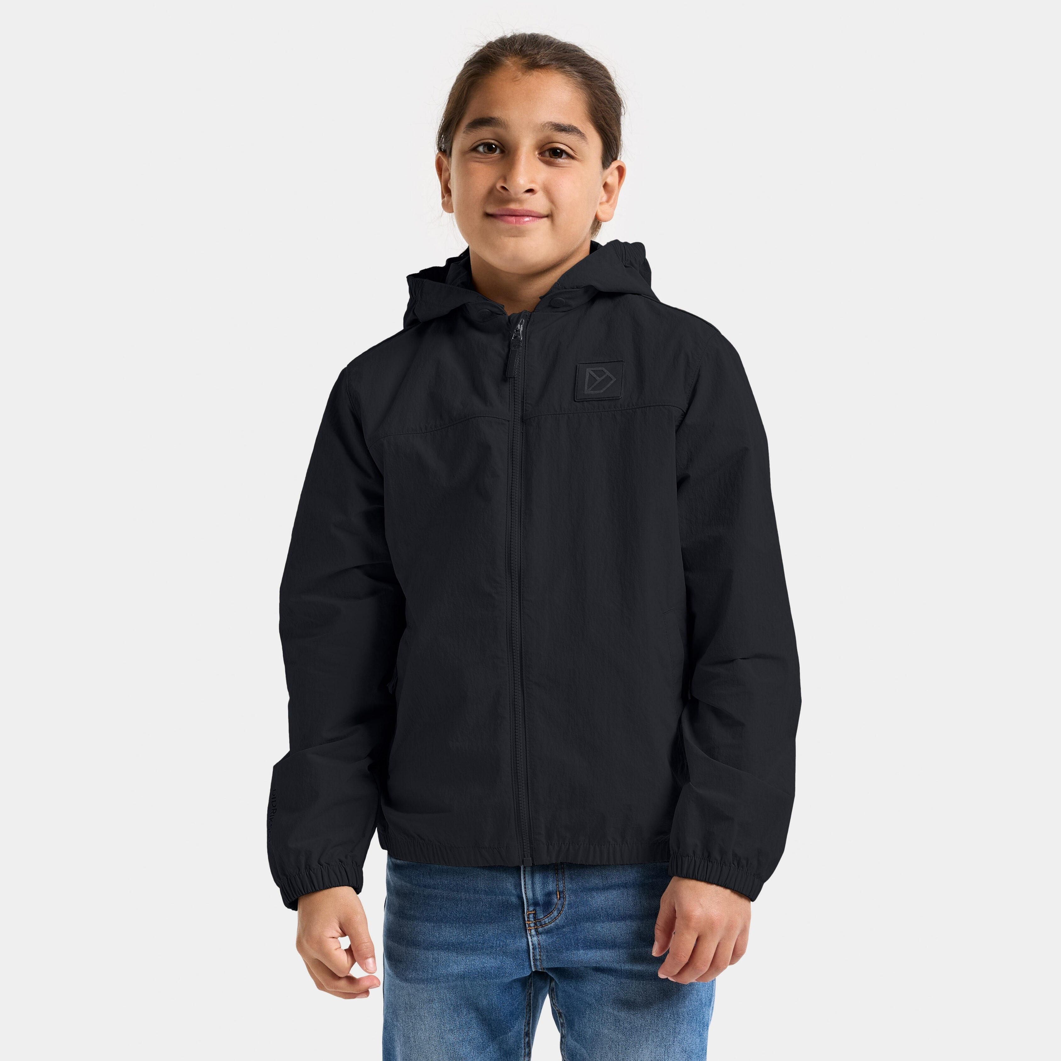 Zink is a windproof jacket for children, suitable for both everyday use and outdoor activities. The jacket is made from a bio-based fabric that combines functionality. It features a detachable hood with an elastic edge and a front zip that makes it easy to put on and take off. The cuffs and hem have elastic bands for a comfortable fit. The jacket also has a reflective logo for increased visibility, and the zip never lies directly against the chin thanks to the collar's design. Designed in Sweden, produced in Bangladesh.